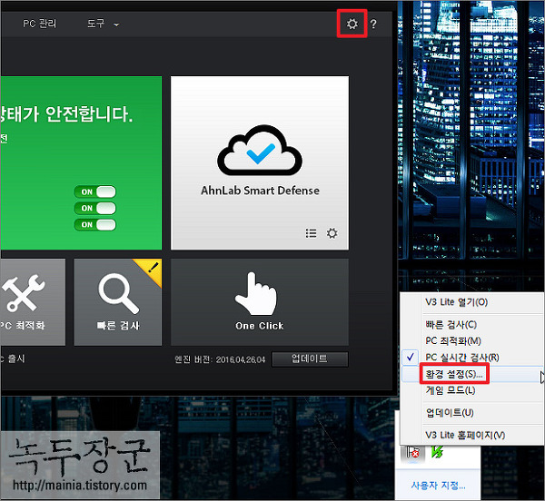 작업 표시줄의 V3 아이콘에 오른 마우스를 눌러 [환경 설정] 메뉴를 선택하는 것입니다.
