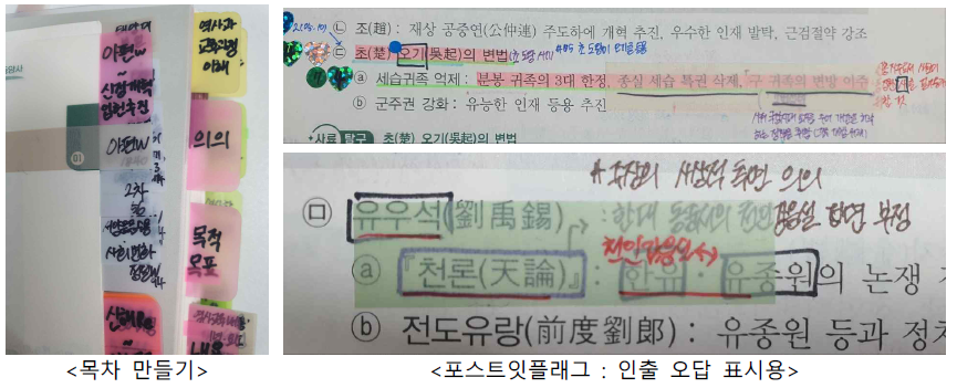 전년도에 해보았을 때 교과서를 완전히 제가 재구조화해서 공부하는 건 어렵더라구요. 교과서 분석 엑셀 파일을 만들었지만 그게 머리에 잘 들어오지도 않았구요. 그래서 저는 비상 교사용 지도서를 참고해 판서를 오려서(갤럭시탭) 삼성노트에 붙이면서 핵심 단어 등을 채워갔습니다. 저는 동학농민운동이 2차 주제로 나왔을 때 시험에 나올 것 같아서 직전 아침까지도 2번을 보고 들어갔기 때문에 지도안을 쓰는 60분 동안 내용에 대해서는 거의 고민을 안 했었고(자료는 너무 어려워서 자료에서는 고민을 많이 했습니다) 새로운 유형에서 고민을 한참 했습니다. 그럼에도 불구하고 무튼 지도안을 다 쓸 수 있었던 건 교과서 공부를 나름 해 간 덕분이라고 생각했는데 이것도 1월에 완성이 되어서 1월 파트에서 말씀드리겠습니다.