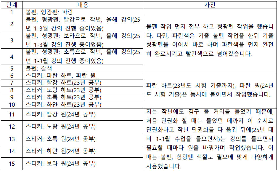① 완벽한 기출 단권화: 스터디 방법을 보시면 아시겠지만 저는 펜의 형식까지 모두 통일했습니다. 이미 말씀드린 것처럼 저는 다시 이후에 또 기출을 분석한적 없이 마음껏 공부하고 싶은대로 할 수 있었습니다.