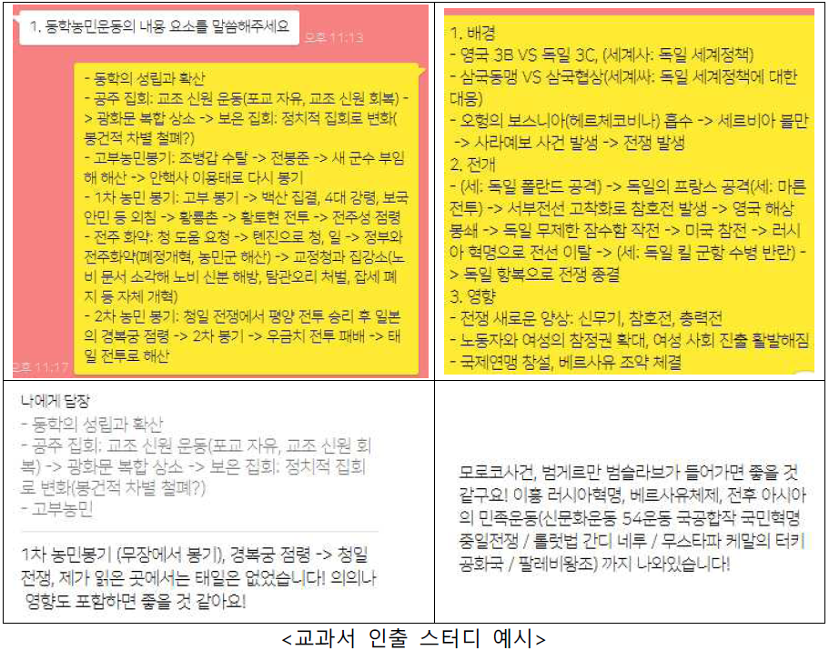 저희는 매일 00-00:40 동안에 각자 하루 동안 공부한 교과서를 인출하도록 했습니다. 이때 인출은 1차 방식의 질문보다 차원을 높여서, 교과서 소단원 이름을 주고 이 안에 들어가는 내용 요소를 모두 말하시오, 라고 문제를 냈습니다. 지도안은 모든 내용 요소를 주지 않습니다. ‘1’이라는 소단원을 주고, 자료와 문제를 통해 ‘B, D’는 줄 때 저희가 알아서 ‘A, C, E’를 생각해 이것을 연결해내는 것이 중요합니다. 이번 2차 시험의 지도안 및 수업실연 내용 요소의 범위는 ‘동학농민운동의 배경’이었고 자료로 준 것은 1차 봉기에 가까웠습니다. 제가 수업실연 때 1가지 조건을 아예 빼먹고(오개념 말하기를 지도안에 쓰고 실연에서 긴장해서 빼먹음), 자료 활용을 잘 못하고, 5분이 남았던 걸 생각하면 내용요소에서는 거의 만점을 받은 것 같은데(현직 교사분들게 시험 후 여쭤본 결과), 저는 앞 단원과의 내용 연결을 고려하여 개항 후 사회경제적 변화, 동학의 창설과 탄압, 교조 신원운동부터 시작했습니다. 내가 어디까지 내다볼 수 있느냐,를 대비하기 위해 저희는 앞서 말한 방식처럼 문제를 내고 답했습니다.