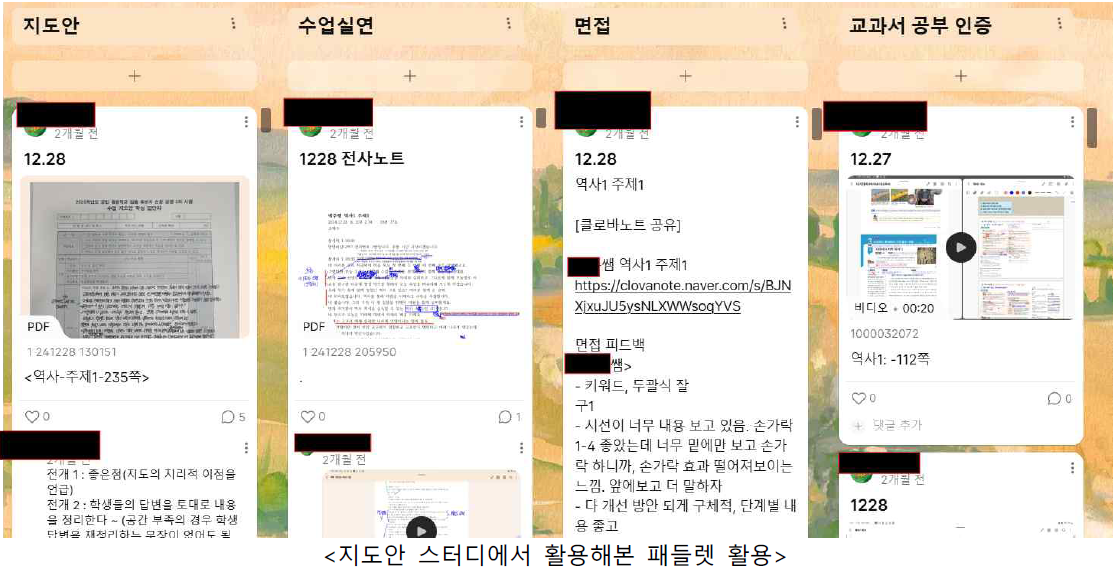 저는 학교에서 시간강사/기간제로 근무해본적이 없습니다. 그래서 12월까지 지도안에 ‘패들렛에 업로드 하게 한다’라는 표현을 매번 썼지만 사실 어떻게 쓰는지 잘 몰랐습니다. 그래서 ‘내가 써봐야 제대로 알겠지. 내가 써보면 제대로 알겠지.’라는 생각을 가지고 모두 함께 패들렛을 사용해주시도록 부탁드렸습니다. 저희는 지도안도 카톡으로 한 번 공유해서 지도안 피드백을 한뒤, 그 내용을 패들렛에 올리게 했습니다(자기 지도안 올리기 + 다른 사람 패들렛에 접속하여 그 사람의 지도안 게시글 아래 피드백 다시 적어주기). 수업실연을 하고 나서도 그 사람이 ‘2025.01.15. 수업실연’이라는 게시글을 만들면 그 아래 말로 했던, 그러나 이미 글로 적어놨던 피드백을 또 옮겨주었습니다. 면접도 마찬가지였습니다. 이렇게까지 패들렛을 썼던 이유는 제가 패들렛에서 페이지를 처음 만들면서 ‘이거 포트폴리오에 너무 좋겠는데?’라고 생각했기 때문입니다. 그래서 저희는 전사노트를 할 때도 각자의 패들렛을 보며 하루를 좀 더 편리하게 정리할 수 있었습니다. 성장용으로도 확인할 수 있었습니다. 파일이 흩어져있지 않고 매일 잘 정리되어있다는 것도 아주 좋은 장점이었습니다.