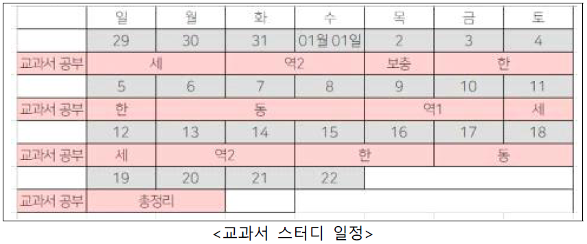 저는 두 분 선생님과 교과서 회독, 인출 스터디도 진행했습니다. 총 2회독을 했습니다. 아래 표를 조금씩 수정해가면서 진행했습니다.