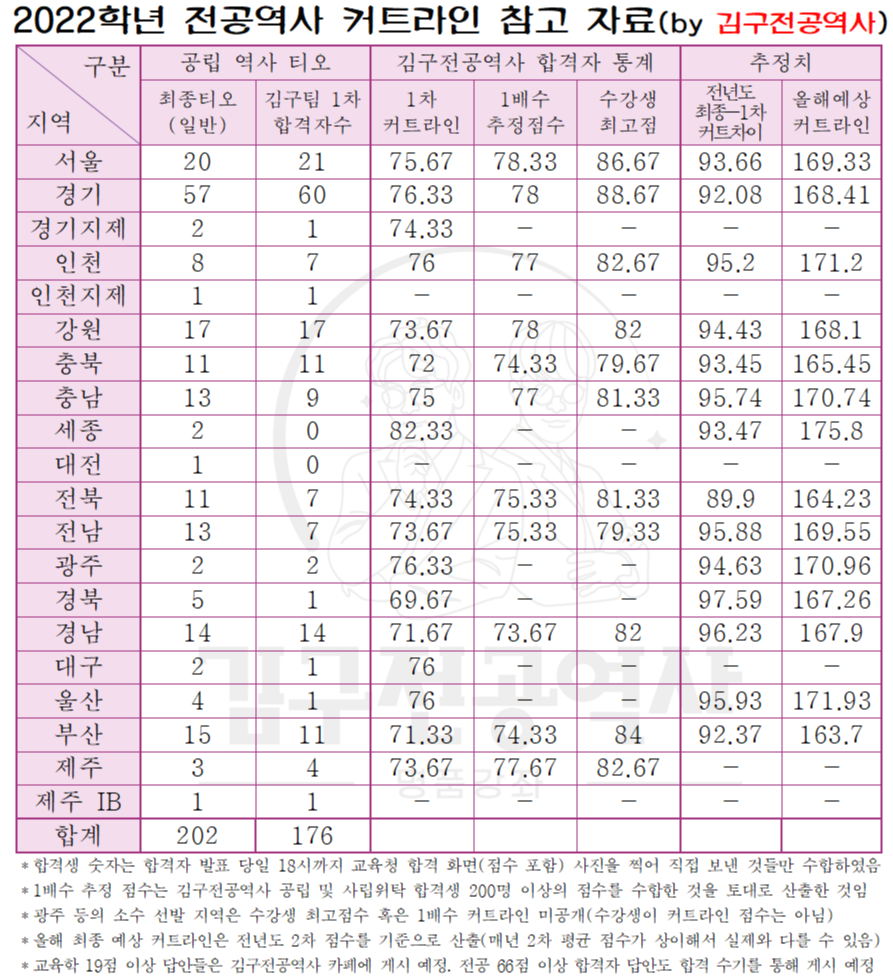 광주 등의 소수 인원 선발 지역은 정확한 1배수 커트라인이 산출되었으나 수강생 보호를 위해 비공개하였습니다.