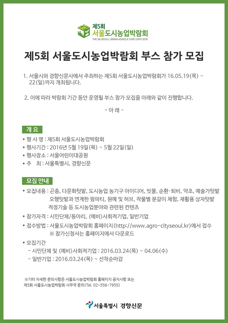 1. 서울시와 경향신문사에서 주최하는 제 5회 서울도시농업박람회가 16.05.19(목)~22(일)까지 개최됩니다.