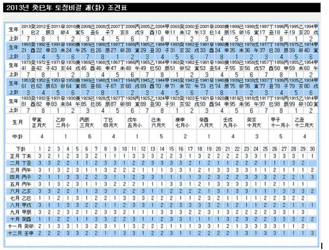 집에 토정비결 책이 있다면, 심심풀이 토정비결 한번 보세요, 그냥 한번 볼 뿐 그 이상도 그 이하도 아니기 바랍니다. 아래의 표는 2013년 계사년 토정비결 작괘조견표 입니다