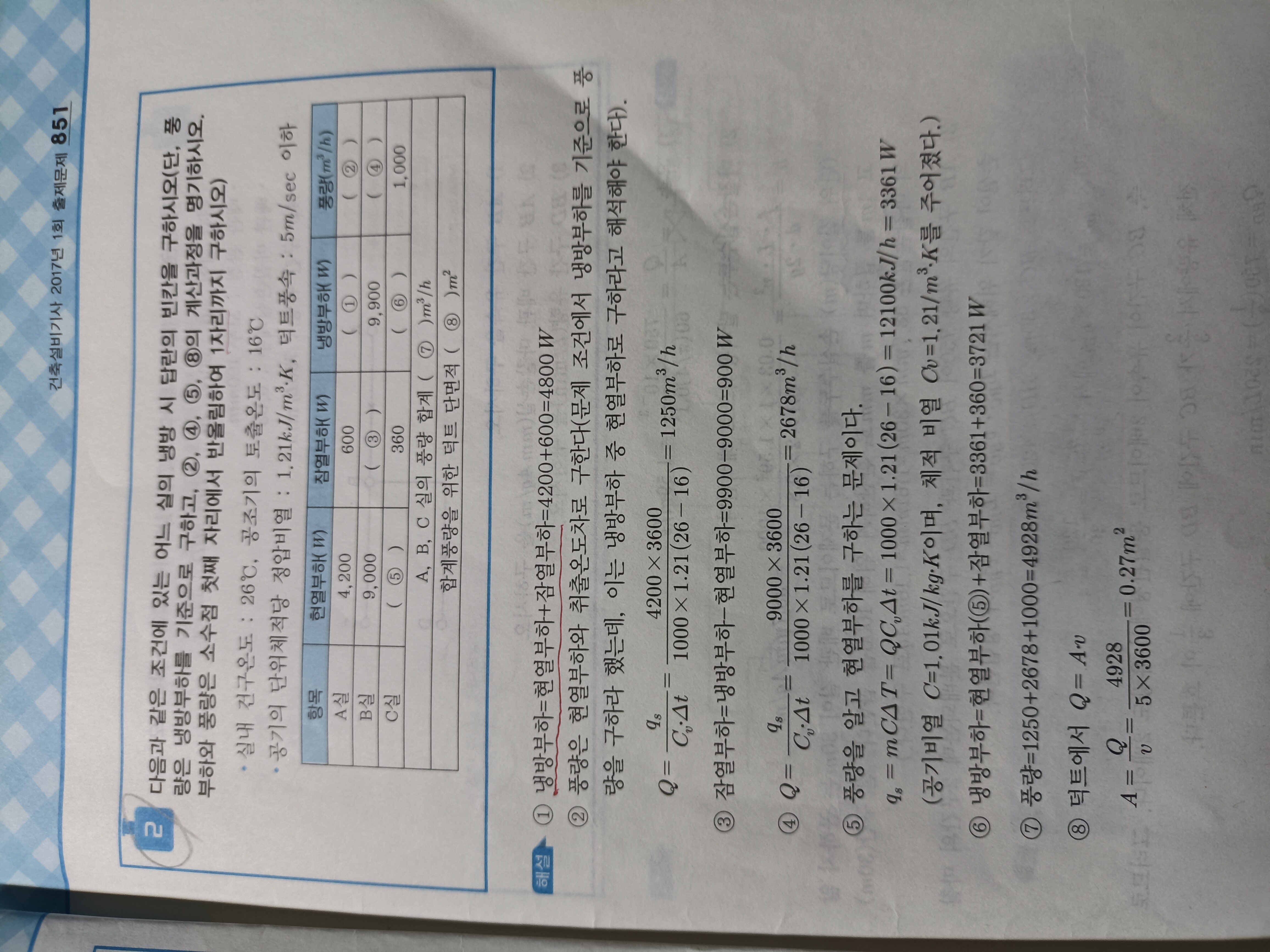 송풍량은 이문제는 온도차를 주었으므로 현열부하와 온도차로 구하며...