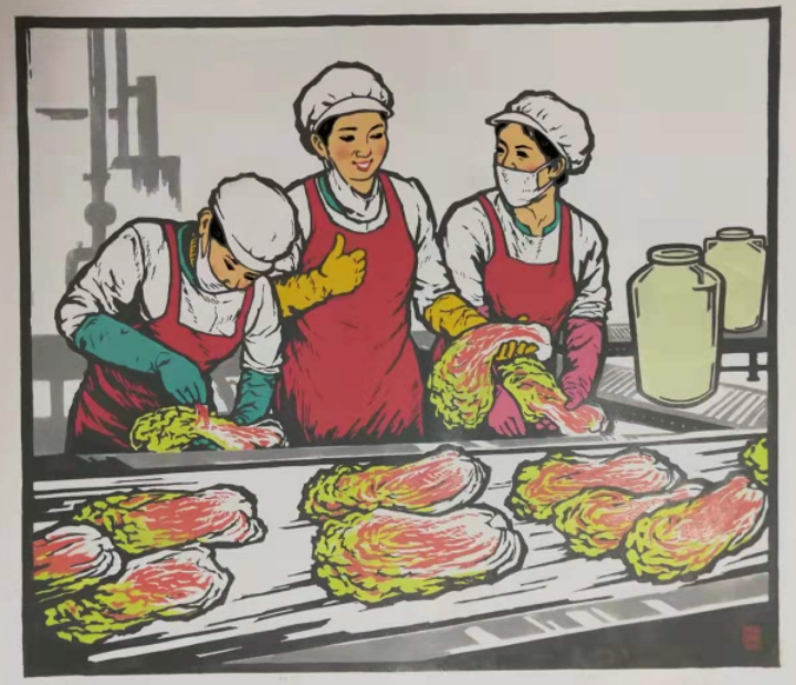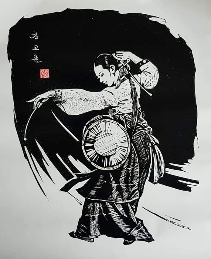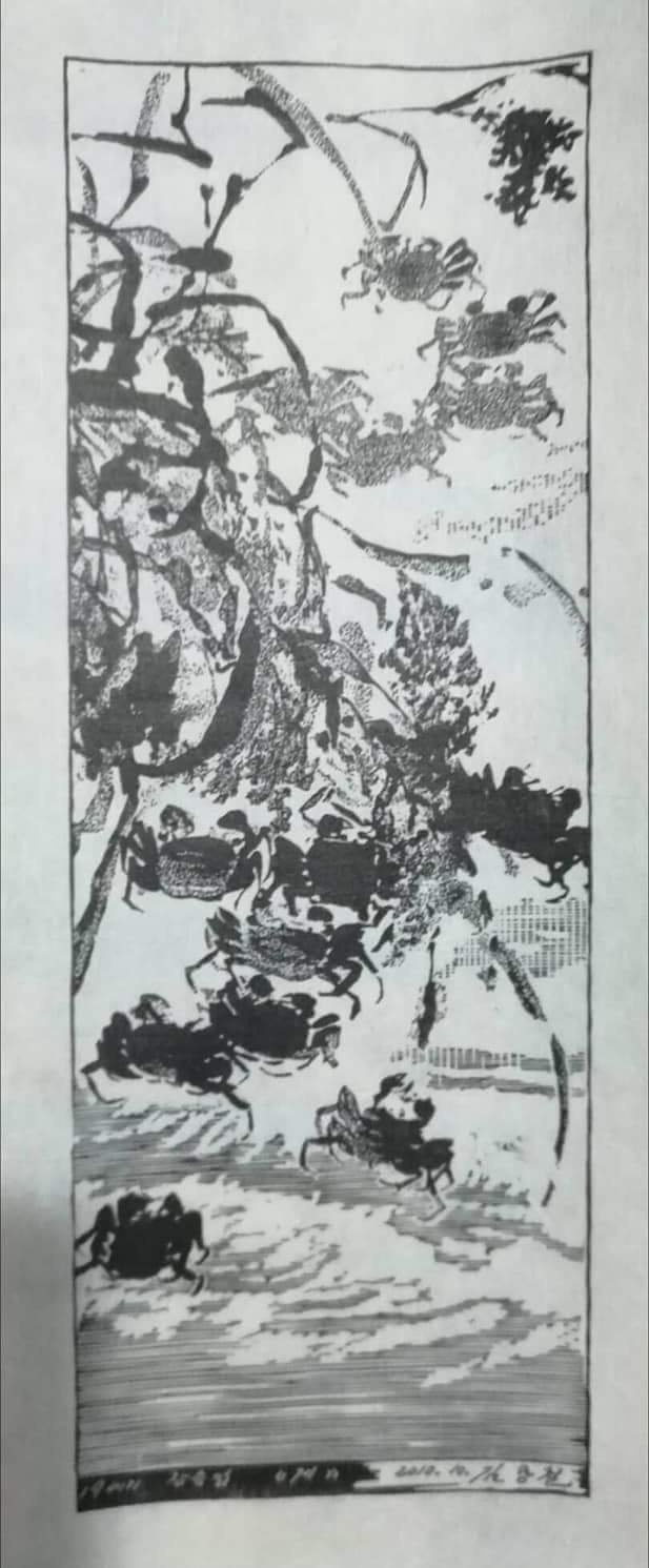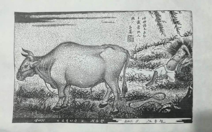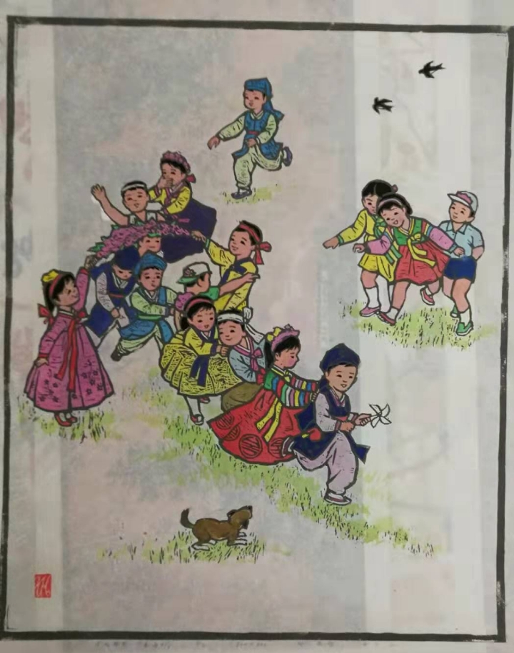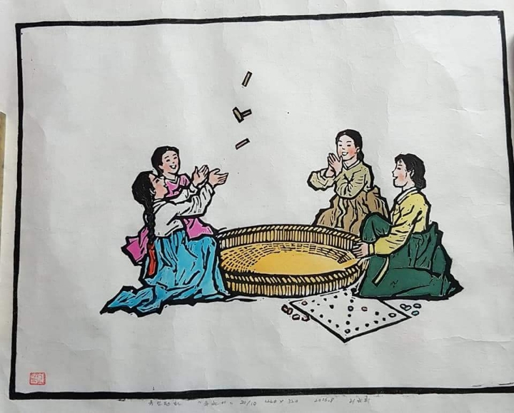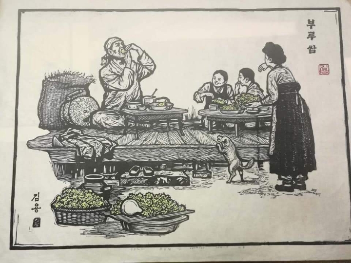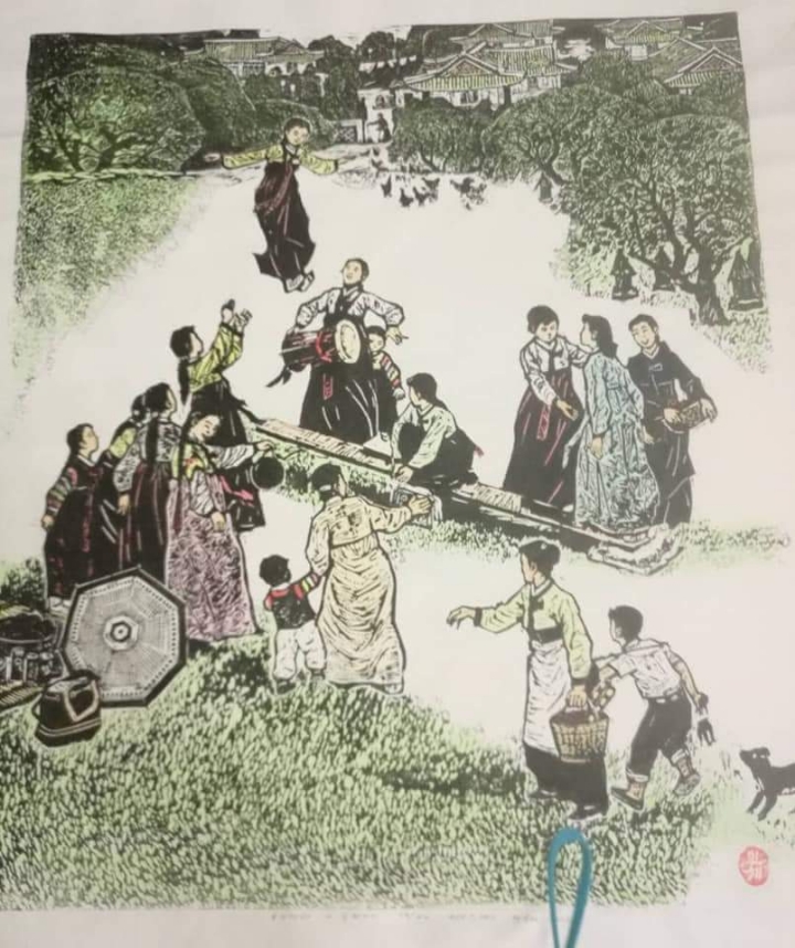 2. 한지에 조선민족 풍속 생활상 등을 선묘로 각을 해서 흑색으로 찍고, 복식 등은 후칠(구륵법, 수채화로 채색)하여 삽화적으로 표현한 것.-속칭 대표적인 월북 조선화가 배운성의 계열로 보인다.