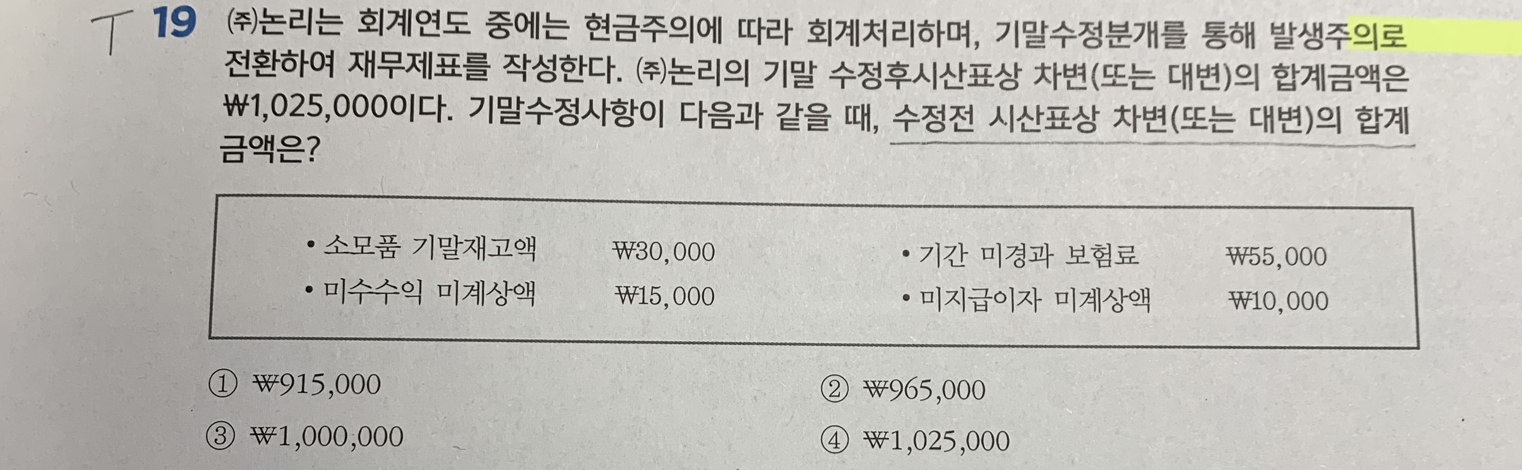 질문드립니다 작성자안녕하세요|작성시간20.12.03|조회수231 목록 댓글 1 글자크기 작게가 글자크기 크게가 2021 논리회계학 재무회계p139 19번 문제에서 왜 소모품과 보험료는 시산표상의 합계에 영향을 주지 않나요?? 감사합니당 다음검색 현재 게시글 추가 기능 열기 북마크 공유하기 신고 센터로 신고 댓글 댓글 1 댓글쓰기 답글쓰기 댓글 리스트 작성자김성수 | 작성시간 20.12.03 문제에서는 결산수정분개가 당기손익에 미치는 영향이 아니라 시산표합계에 영향을 물어보는 것입니다.그러므로 기말수정분개시 역분개가 이루어지는 소모품, 선급비용, 선수수익은 시산표를 증가시키지 못합니다. 댓글 전체보기