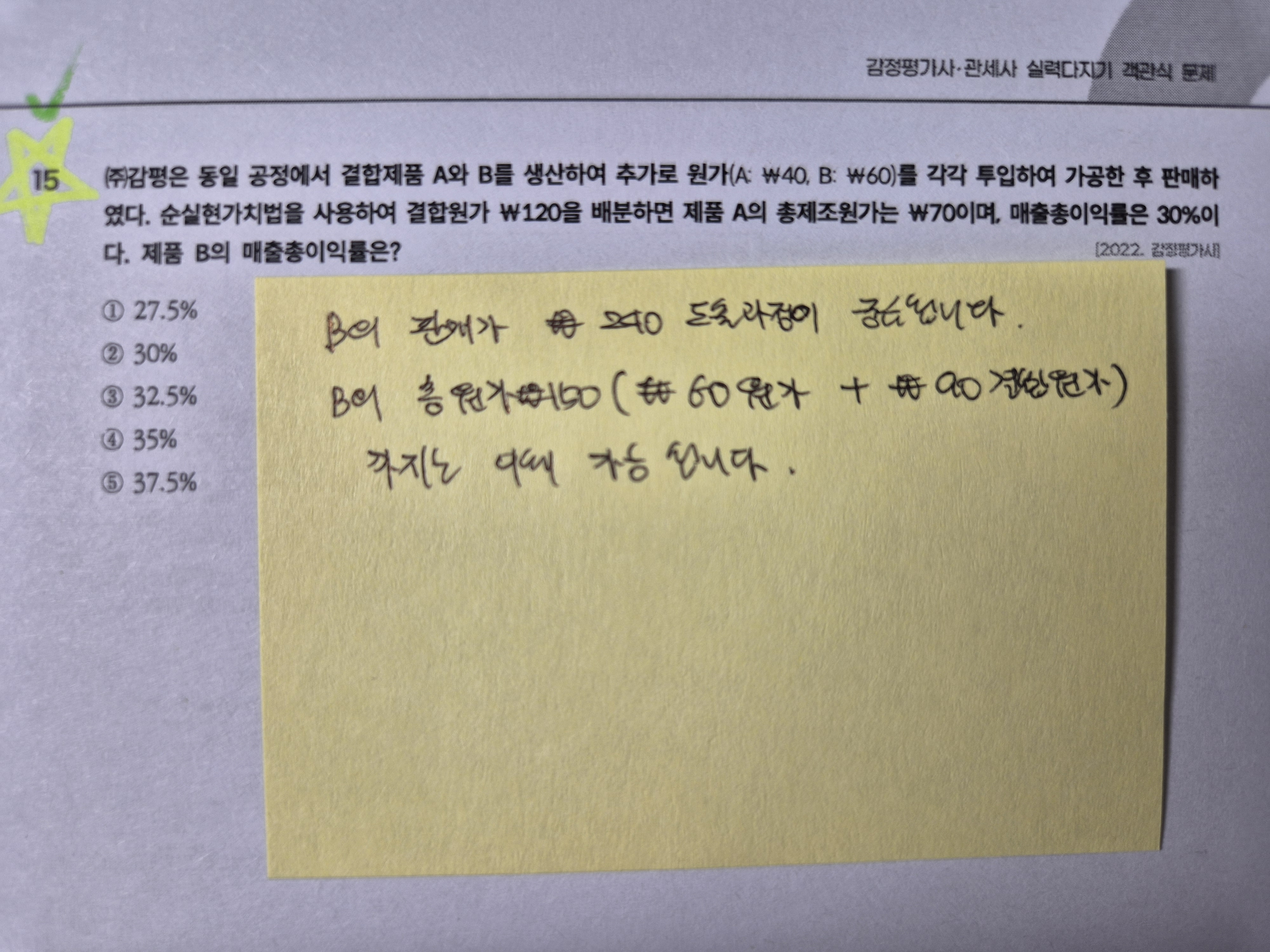작성자김성수 작성시간 25.12.06 15번 균등이익률법은 우선 전체의 매출총이익률을 계산하고 이를 통해 개별제품의 판매가에서 매출원가율(1-매출총이익률)을 곱하여 제조원가를 계산합니다. 여기서 추가가공원가를 우선계산후 나머지가 결합원가배부액이됩니다.