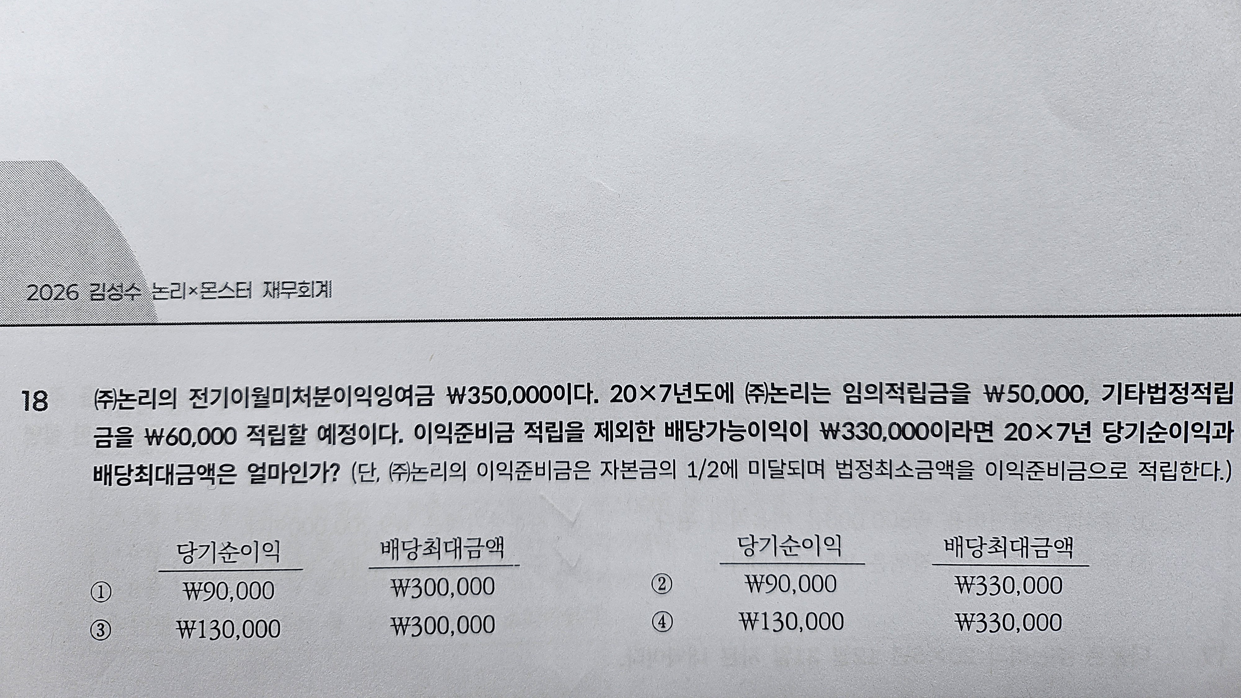 실력다지기 p116 18번 작성자찬스패기|작성시간25.12.18|조회수28 목록 댓글 1 글자크기 작게가 글자크기 크게가 당기순이익 ₩90,000은 어떻게 구하나요? 그리고 https://m.cafe.daum.net/kimssaccounting/WQgu/4346댓글로 추가 질문드린거 답변 부탁드려요. 다음검색 현재 게시글 추가 기능 열기 북마크 공유하기 신고 센터로 신고 댓글 댓글 1 댓글쓰기 답글쓰기 댓글 리스트 작성자김성수 | 작성시간 25.12.19 전기이월미처분이익잉여금 + 당기순이익 -임의적립금 적립 - 기타법정적립금 적립 = 배당가능이익여기에 대입해서 당기순이익을 도출하게 된 것입니다. 댓글 전체보기