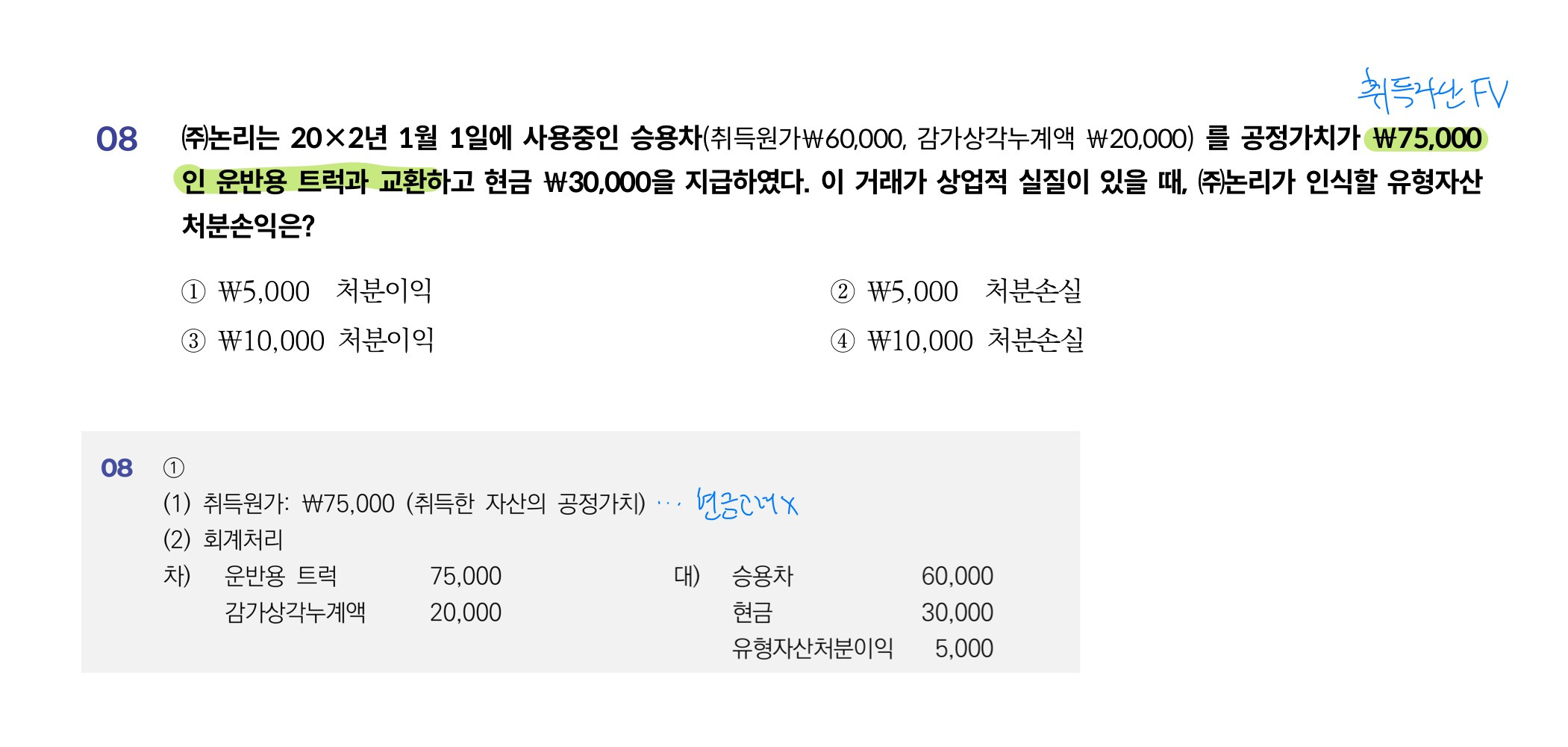 공무원 실력다지기 p41 2번 작성자송도토리|작성시간25.12.18|조회수35 목록 댓글 1 글자크기 작게가 글자크기 크게가 2번 회계처리가 궁금합니다.8번처럼 푸는게 아닐까요...?? 다음검색 현재 게시글 추가 기능 열기 북마크 공유하기 신고 센터로 신고 댓글 댓글 1 댓글쓰기 답글쓰기 댓글 리스트 작성자김성수 | 작성시간 25.12.19 8번은 취득한 자산의 공정가치가 더 명백한 경우이므로 예외에 해당합니다.기본이론만 들으신 상태라면 설명하지 않은 것입니다. 기본이론만 들으신 상태라면 8번은 심화이론이후 혹은 문제풀이때 정리하시길 바랍니다. 댓글 전체보기