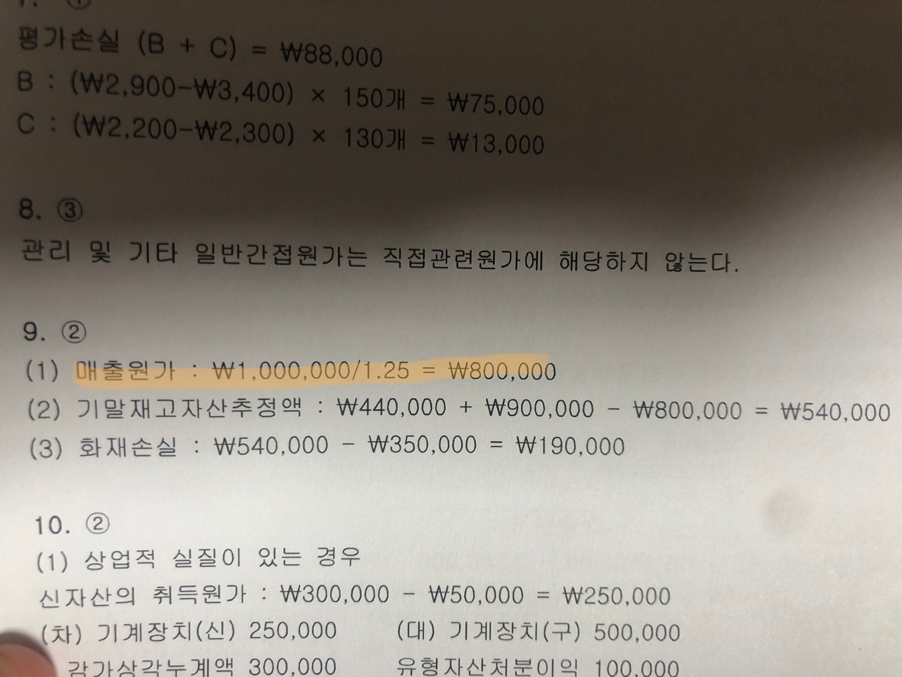 그런데 해설지에는 매출원가가 '1,000,000/1.25'로 800,000만 원이라고 하네요. 어디서부터 잘못된 거죠 ㅜㅜ