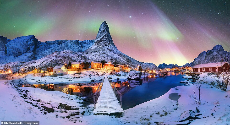 1. Light show: The aurora borealis above the snowy islands of Lofoten, where fishing villages are found in magnificent fjords. 빛의 쇼: 어촌 마을들이 장엄한 피요르드(피요르)에서 발견되는 눈 덮인 로포튼 섬 상공의 북극광.