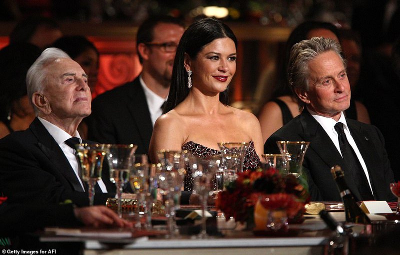 1. Hollywood acting legend Kirk Douglas died on Wednesday aged 103. He is pictured above in 2018 at his son Michael's Hollywood Walk Of Fame ceremony. 할리우드 연기의 전설 커크 더글러스(Kirk Douglas)는 103세의 일기로 수요일에 사망했다. 그는 2018년 그의 아들 마이클(Michael)의 할리우드 명예의 거리 행사에서 위 사진을 찍었다. 2. The Hollywood acting legend is pictured with his son Michael and daughter-in-law Catherine Zeta-Jones in 2009. 할리우드 연기의 전설은 2009년에 그의 아들 마이클과 며느리 캐서린 제타 존스가 함께 사진 찍는다.