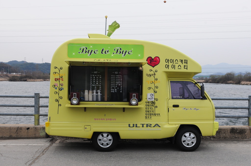 노란색의 멋진 자그마한 차 카페...