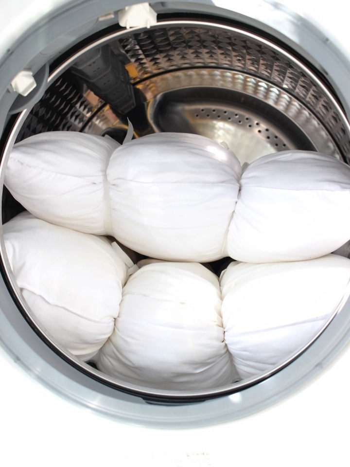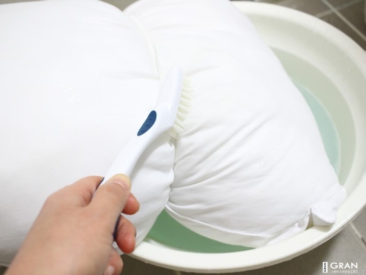 얼룩이 심한 베개 솜은 꼭! 얼룩진 곳을 세제 묻혀 솔로 가볍게 문지르고 세탁기에 돌리기,