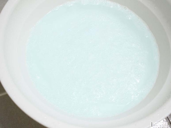 베이킹소다와 과탄산소다, 세탁 세제를 각각 티스푼 두 개 정도씩 넣고 물에 녹여주세요.
