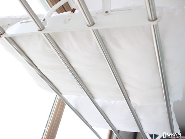 세탁기 끝난 베개 솜은 고무줄을 풀어 건조대에 올려주세요.
