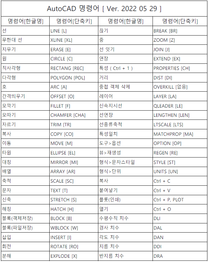 다음은, 기계설계와 기계가공 실무에서 많이 쓰이는 오토캐드 명령어 단축키를 모은 리스트입니다. 많은 활용 바랍니다.