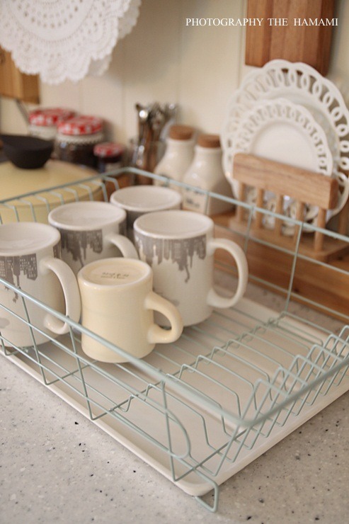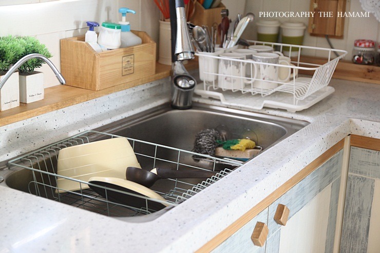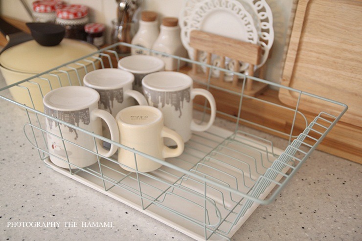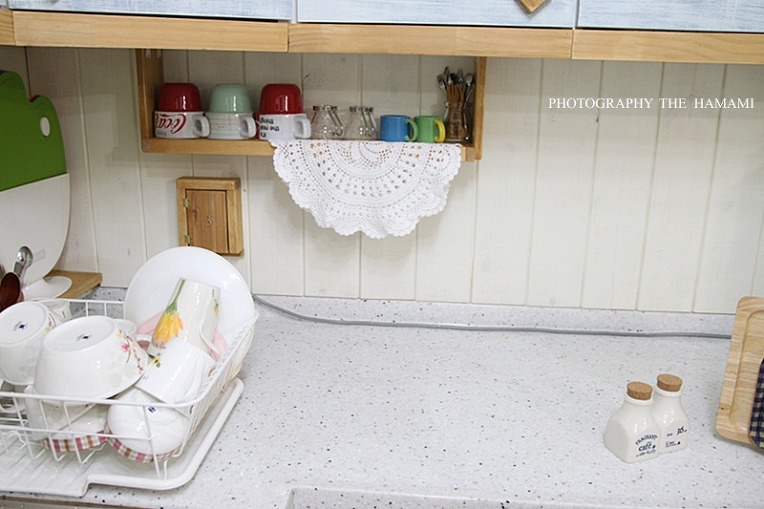 커다란 식기건조대가 주방벽면을 차지하고 있어서