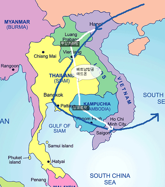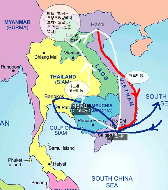하얀색 : 한국-하노이-루앙프라방-씨엡리업-호치민-한국