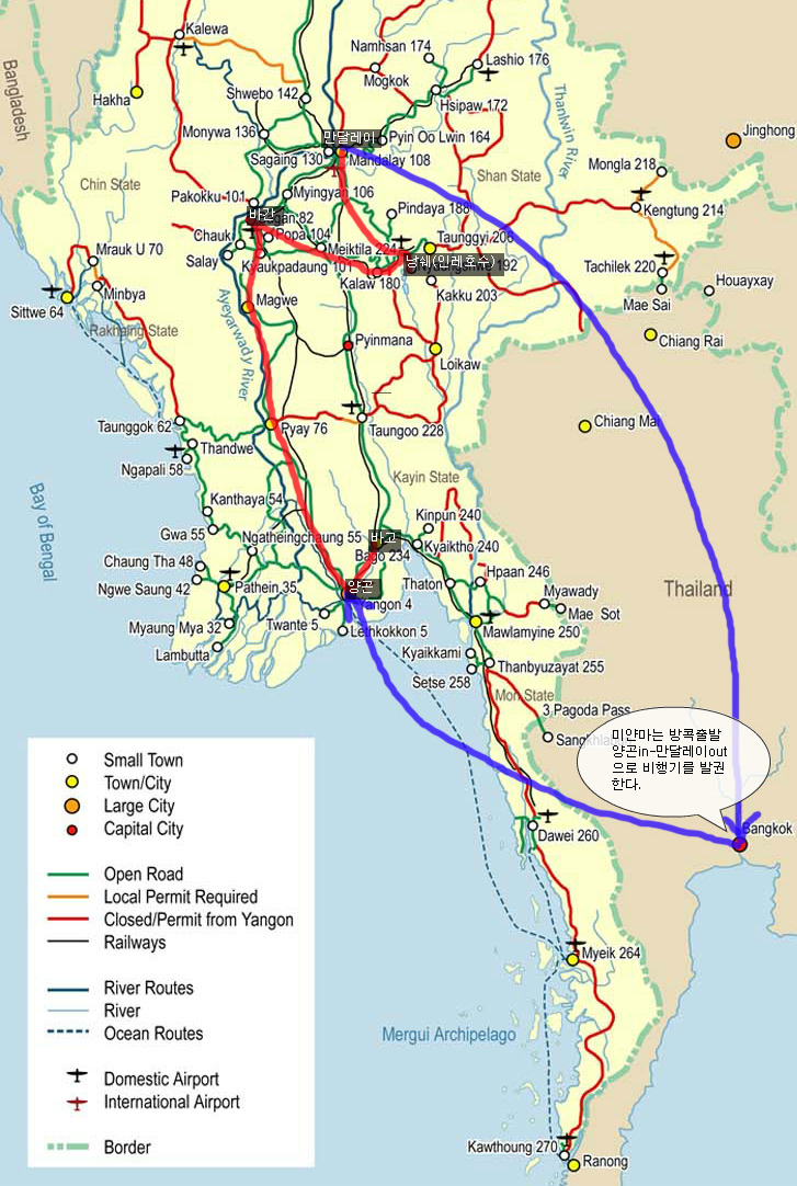 양곤으로 들어갔다가 만달레이로 나오던지 아니면 그 역으로 만달레이로 들어갔다가 양곤으로 출국이 가능하다.