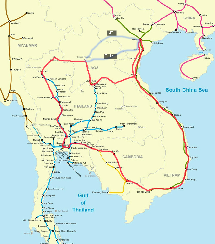 위 지도에는 없다고 했는데, 2013년 현재 앙코르왓에서 라오스 남부 씨판돈까지 여행사 버스가 생겼다고 함.