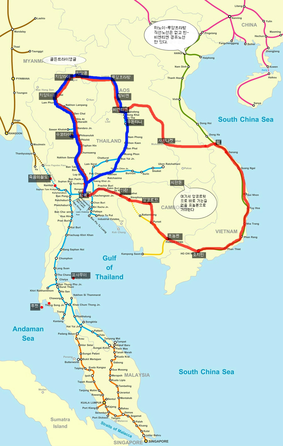 위 루트는 가장 일반적인 동남아 루트로서 오로지 육로이동만을 생각한 것이다.