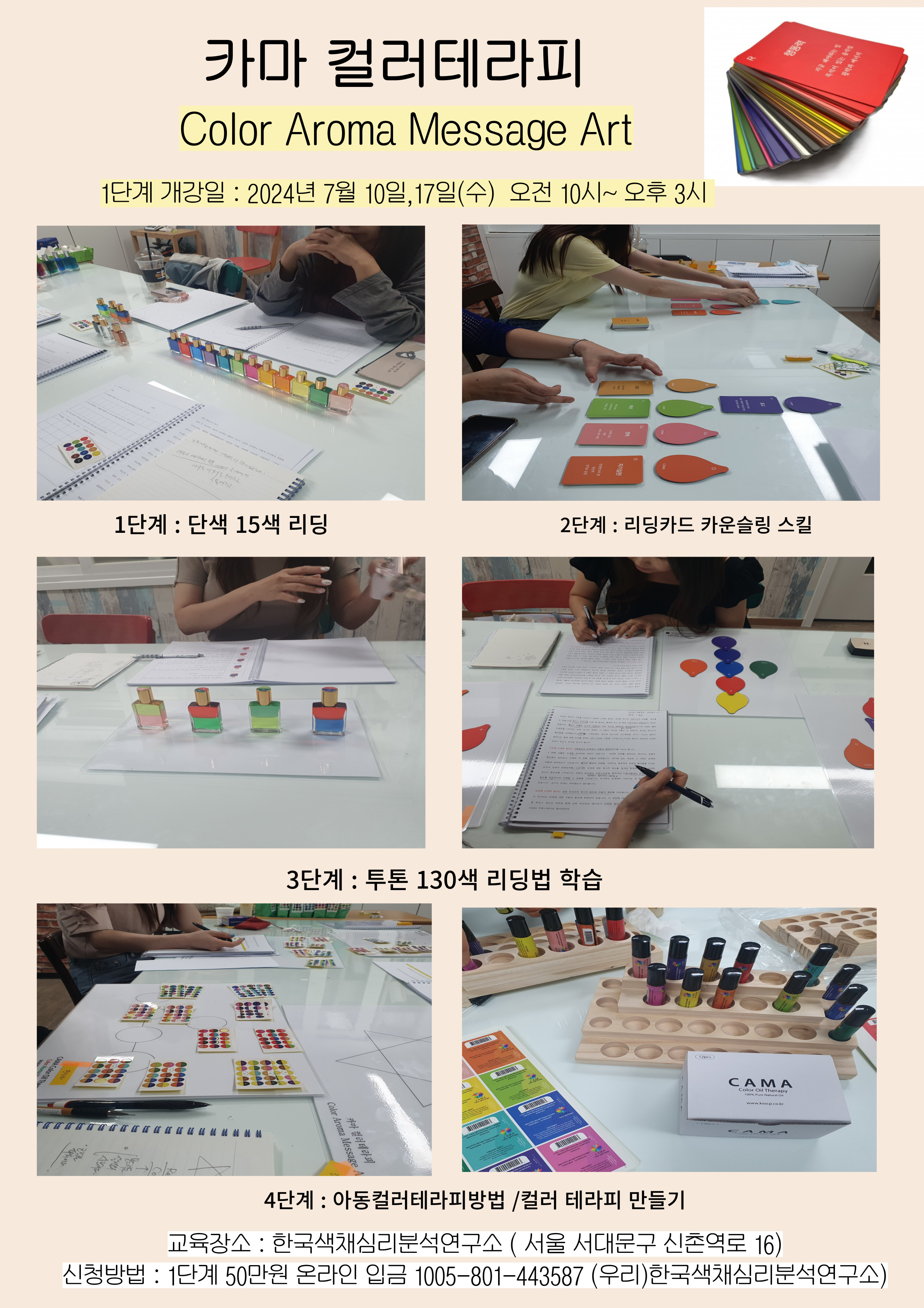 컬러테라피 교육 안내 작성자한국색채심리분석연구소|작성시간24.06.19|조회수25 목록 댓글 0 글자크기 작게가 글자크기 크게가 컬러테라피 교육 안내 입니다 다음검색 현재 게시글 추가 기능 열기 북마크 공유하기 신고 센터로 신고 댓글 댓글 0 댓글쓰기 답글쓰기 댓글 리스트