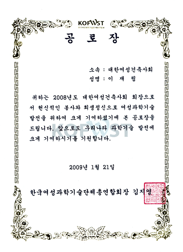 우리 회가 지난 1월에 여성과학기술단체총연합회(여과총)에서 공로상을 수상했습니다.