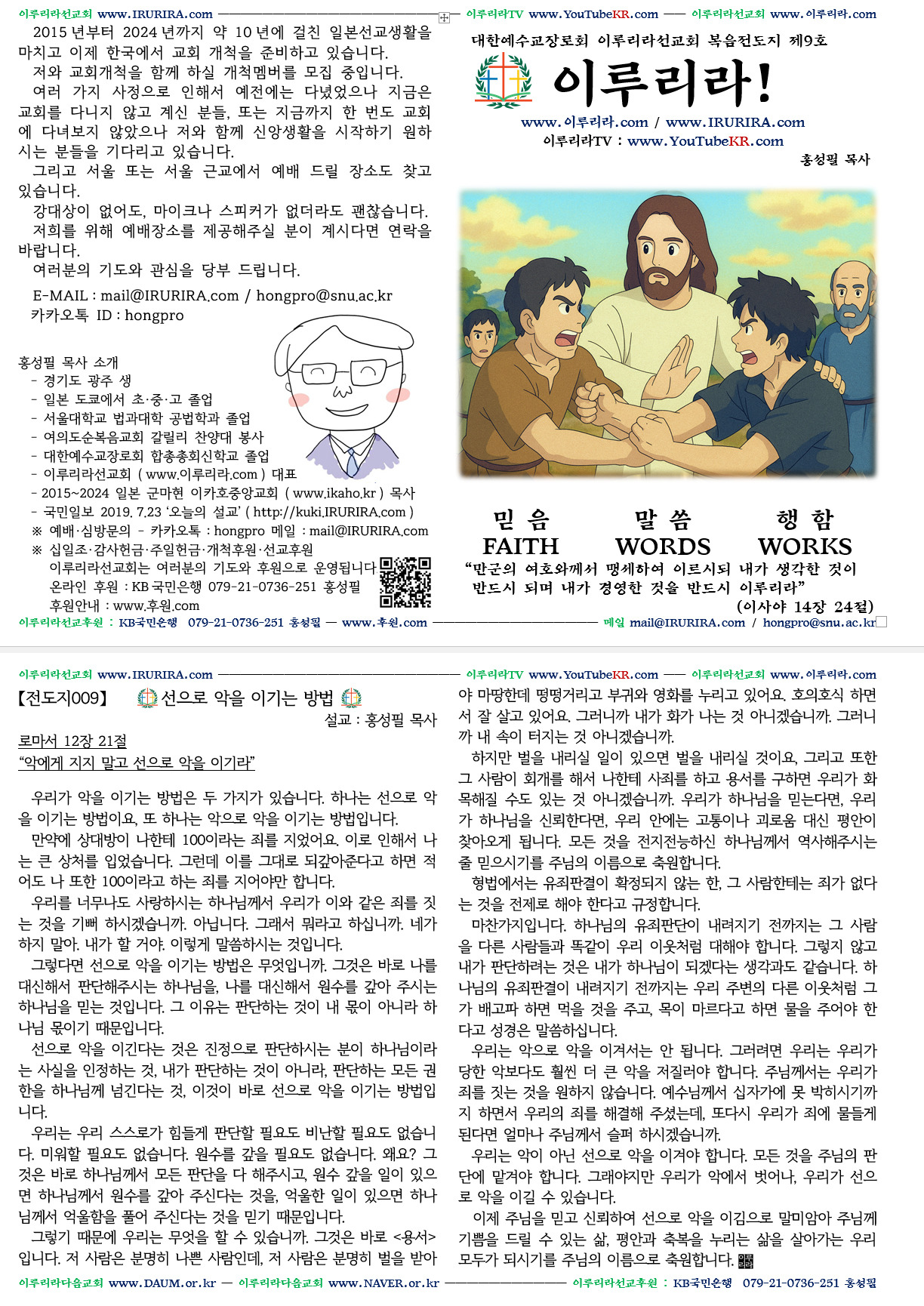 이루리라선교회 최신 복음전도지 '이루리라!' 제9호입니다! 2025-11-01 작성자홍성필 목사|작성시간25.03.13|조회수710 목록 댓글 0 글자크기 작게가 글자크기 크게가 이루리라선교회 최신 복음 전도지 <이루리라!> 입니다.양면 인쇄로도 활용하실 수 있습니다.은혜 받으시고 전도용으로 활용해 주세요. IRURIRA_009.pdf402.00KB 첨부파일첨부된 파일이 2개 있습니다. pdf 파일 IRURIRA_009.pdf 다운로드 jpg 파일 이루리라전도지_2025_11_01_00.jpg 다운로드 다음검색 현재 게시글 추가 기능 열기 북마크 공유하기 신고 센터로 신고 댓글 댓글 0 댓글쓰기 답글쓰기 댓글 리스트