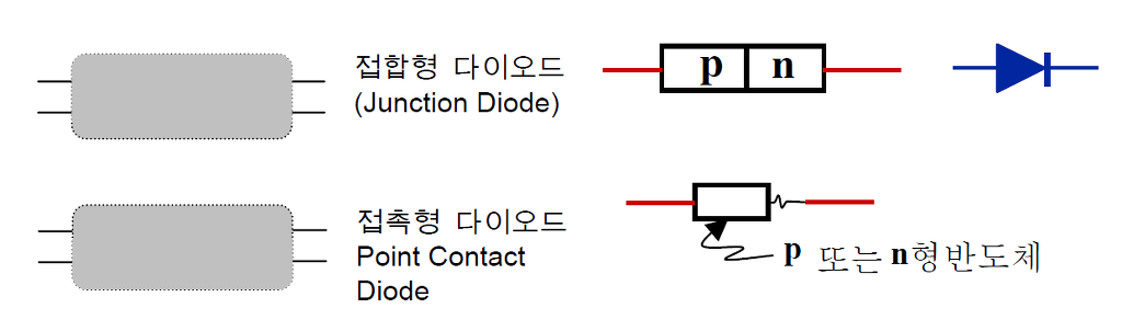 위에서와 같이 p형 반도체와 n형 반도체를 서로 면으로 접촉시켜 놓은 것을 접합(Junction)형 다이오드라 한다. 마찬가지로 n형 또는 p형 반도체에 날카로운 도체를 접촉시켜 놓은 것도 똑 같이 다이오드의 역할을 한다. 이런 형태의 다이오드를 점접촉(Point Contact)다이오드라 하고 점접촉을 위한 날카로운 금속선은 고양이의 수염과 같은 형태를 하기 때문에 고양이수염(Cat’s Whisker)라 한다.
