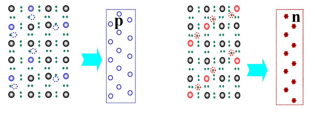 앞 절에서의 반도체를 구조상의 내용을 일반화하여 다음 그림과 같이 정공을 많이 가지고 있는 p형 반도체와 여유전자(Excess Electron)를 많이 가지고 있는 n형 반도체로 표시해 준다.