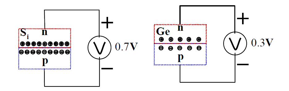 이렇게 p-n접합면에 형성되는 전기적 에너지는 전압으로 측정되고 반도체를 실리콘물질을 기반으로 사용하였을 경우는 약0.7v, 게르마늄의 경우 약0.3v정도의 전위(Electric Potential)가 형성된다