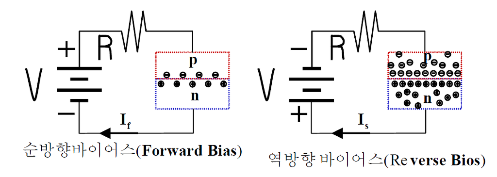 즉 전압을 p형 반도체 쪽에 ⊕, n형 반도체 쪽에 ㊀를 걸어주면 다이오드를 통해서 전류가 흐르게 된다. 이런 현상이 일어나는 경우 걸어준 전압을 순방향 바이어스(Forward Bias)라 한다.