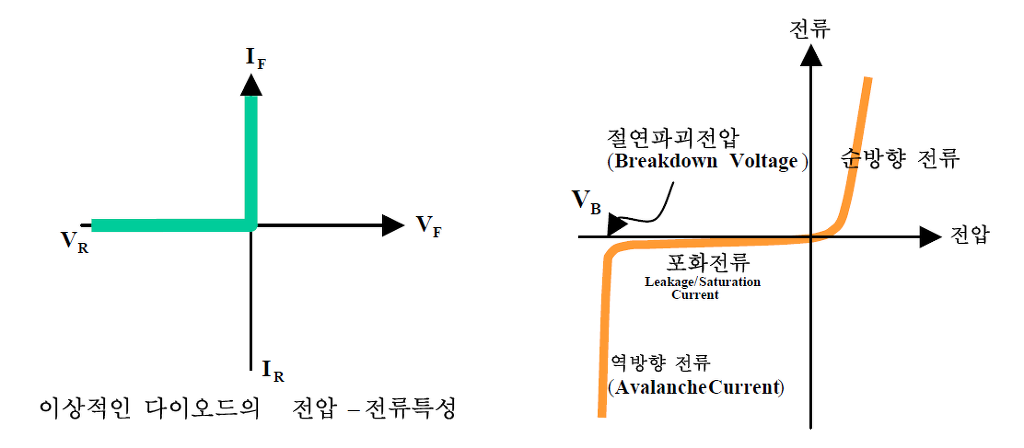 이상적인 다이오드의 경우는 전원을 껐다 켰다 하는 스위치의 경우와 같고 이런 경우는 순방향 바이어스가 걸렸을 때는 스위치를 켠 경우이고 역방향 바이어스가 걸렸을 경우는 스위치를 껐을 경우이다.