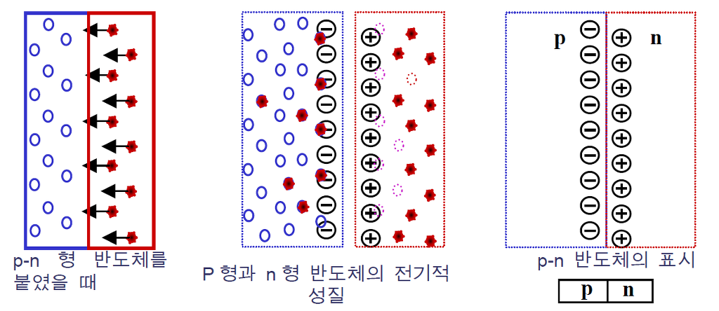형 반도체는 구조적으로 전자를 보충하여야 할 입장이고 n형 반도체는 구조적으로 공유결합에 참여하지 못한 여분의 전자를 가지고 있는 실정인데 두 물질이 접합함으로써 자연스럽게 n형 반도체 쪽의 여유전자들은 p형 반도체의 정공쪽으로 이동하여 구조적인 자리를 메꾸고 들어가게 된다. 즉 두 물질이 접합한 접합면에 가까운 곳에서는 활발한 전자의 확산을 통한 이동이 이루어 지게 된다. 그러면 물질 자체는 전기적으로 중성이던 것이 p형 반도체는 전자를 받아들임으로써 전기적으로 ㊀를 띠게 되고 n형 반도체는 전기적으로 ⊕가 된다.