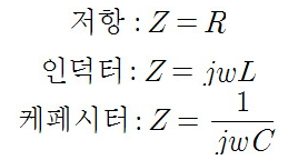 임피던스를 Z 라고 표시하면 저항(R = Resistance), 인덕터(L = inductance), 케피시터(C = Capacitance)의 임피던스는 아래와 같은 값을 가진다. 물론 단위는 옴(Ω) 이다.