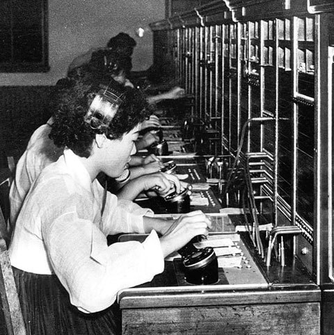 교환기의 기술이 발달하기 전까지 전화교환을 위해 교환원이 있어야 했다. 사진은 전화 교환원의 모습