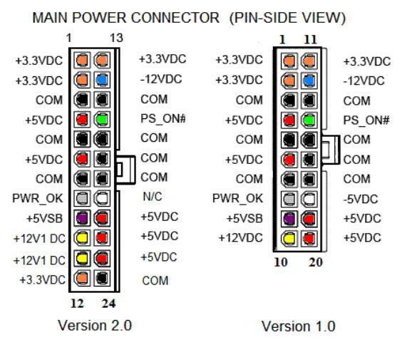 메인보드 연결 케이블 20PIN Standard ATX Connector 메인보드에 전류를 공급해주기 위한 케이블 묶음은 20핀짜리 커넥터에 연결되어 있으며 노란색,빨간색,주홍색,흰색,파란색,검은색의 케이블이 있다. 이 20개의 케이블중 중요한 의미를 가지는 것은 8번(회색),9번(보라색),14번선(녹색선)이다.이중 8번선은 파워서플라이가 정상적으로 작동한다고 메인보드가 판단할 때 파워서플라이가 공급하는 +5V 전원선이다.