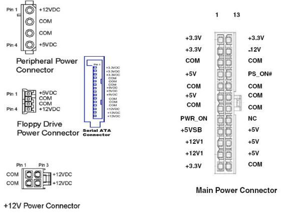 PC에서 필요로 하는 전압 PC가 동작하는 데는 메인보드,HDD,CD-ROM 등 각 부분별로 3.3V,+5V,-5V,+12V,-12V의 직류전압을 필요로 한다. 이에 따라 파워서플라이는 220V 교류전원을 직류로 바꾼 뒤 각각의 부품이 필요한 전압을 전선(케이블)으로 공급해주며 케이블 끝에는 서로 연결할 수 있도록 커넥터가 달려 있다. PC 각 부분별로 보면 메인보드는 위의 3.3V, +5V, -5V, +12V, -12V의 5가지를 모두 사용한다. 나머지 드라이브 장치는 +5V와 +12V를 사용한다.