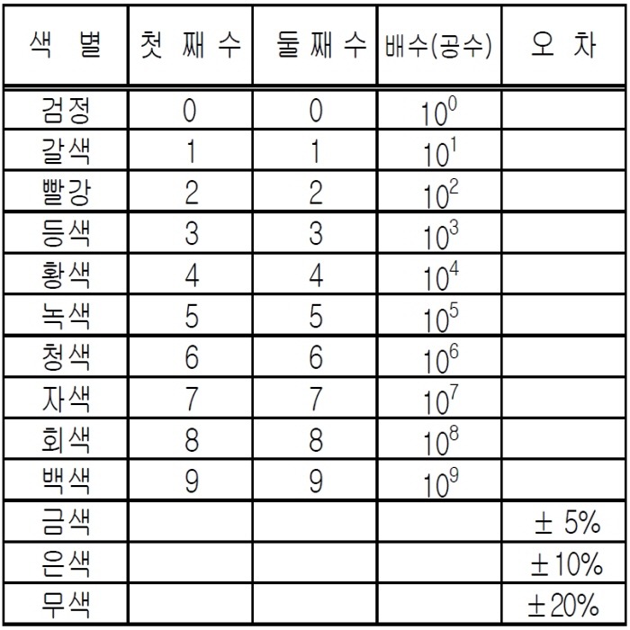 다음은 저항값 읽는 법에 대하여 설명 : 저항값의 표준에 대해서는 우리나라 KS 규격으로도 정해져 있지만, KS 규격은 그 대부분이 일본 JIS 규격을 모방(?)하고 있으며, 실제로 업계에서는 JIS 규격을 훨씬 많이 이용하고 있다. 여기서도 JIS를 기준으로 설명하겠슴. 저항값의 수치 분할 방법은 JIS C5001에서 E 표준 계열로 정해져 있다. 이것은 10을 대수적으로 몇 등분하여 정해져 있는데...