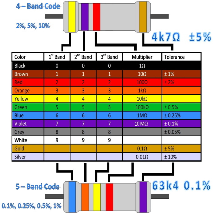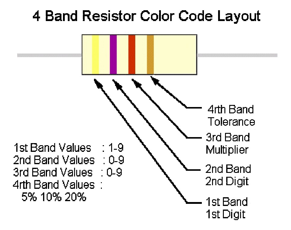 위의 그래프를 통해 저항값을 읽을 경우 왼쪽에서 오른쪽으로 적색, 보라색, 갈색, 금색 순으로 표시 되어 있을 때는 적색=2, 보라색=7, 갈색=1, 금색=± 5 %을 나타내고 있으므로 이 저항값은 27×10 =270Ω이 된다. 여기서 오차는 ± 5 %가 된다. 여러 개의 저항으로 저항 읽는 연습을 한다면 쉽게 저항을 읽을 수있을 것이다.