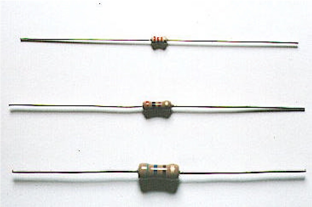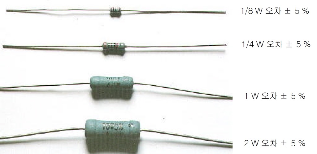 전자회로에서 흔히 사용되는 것으로 1/8W, 1/4W, 1/2W 등이 있는데 오디오나 텔레비젼 등의 가전 제품에도 많이 사용됩니다. 전자회로의 신호회로(미약전류)에서는 1/8W나1/4W 로 충분하지만, 전원회로, 발광 다이오드의 전류제어용 또는 고출력 amp 과 같은 저항기에는 생각보다 큰 전류가 흐르기 때문에 정격전력을 생각하여 사용해야 합니다