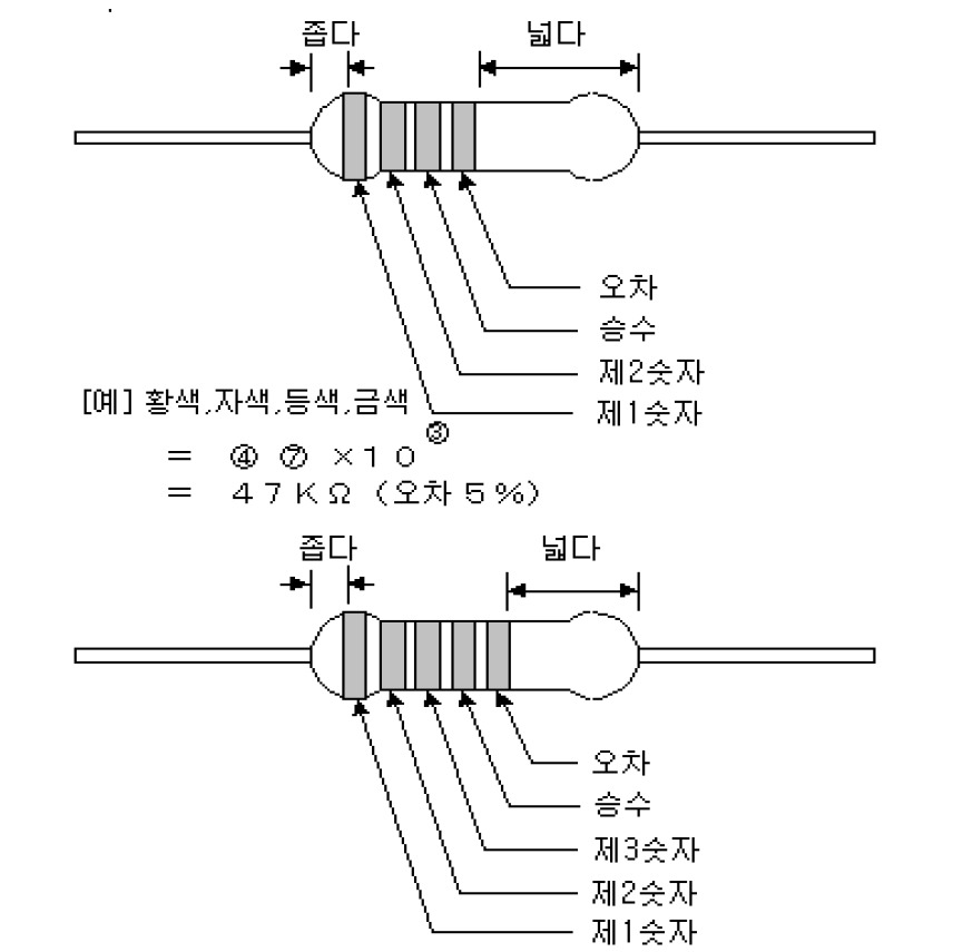 가장 일반적인 저항은 carbon solid 저항기인데 1/4 또는 1/2 W, 1Ω∼100MΩ,5% or 10%를 갖는 표준저항기 set이랍니다.