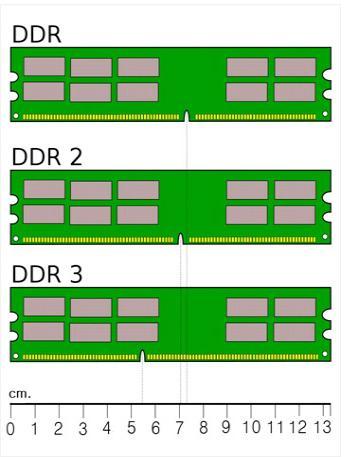 데스크탑용 DDR-SDRAM 계열 램 모듈의 형태 비교. 슬롯 접촉부에 있는 홈의 위치가 조금씩 다르다.