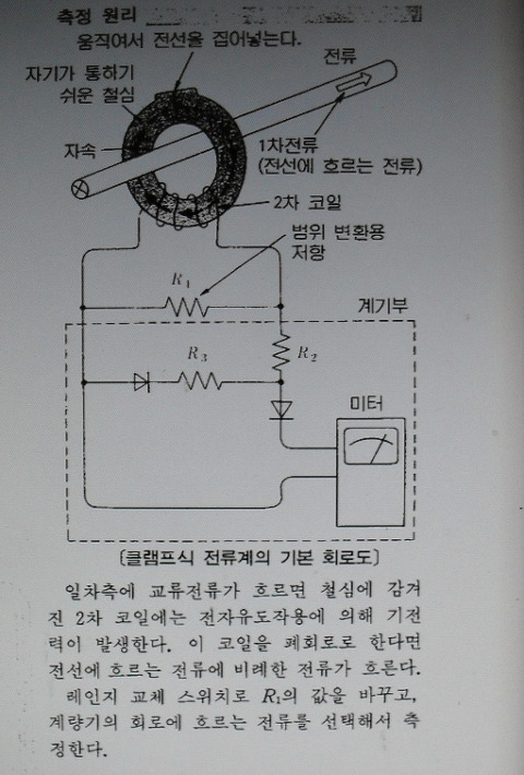 위의 그림과 같이 클램프가 전선을 감으면서 일종의 변압기 역할을 하는데 클램프 자체가 코어이고 코어 속으로 전선이 들어가서 전류가 흐르면 이것이 곧 1차 코일이 되고 2차 코일은 후크메타 내부에 코일을 감아서 그 비율로 계기판에 나타나게 함으로써 교류전류를 측정하게 된다.