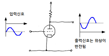 그 다음 증폭 회로의 가장 중요한 성질로서 신호의위상 반전이 있습니다. 부하선을 잘 보면 알수 있듯이, 그리드에 걸리는 신호가 (+)로 진동하면 양극전압은 감소합니다. 이 때문에 그리드의 신호와 양극에 나타나는 신호는 그림처럼 정확하게 반전하게 됩니다.