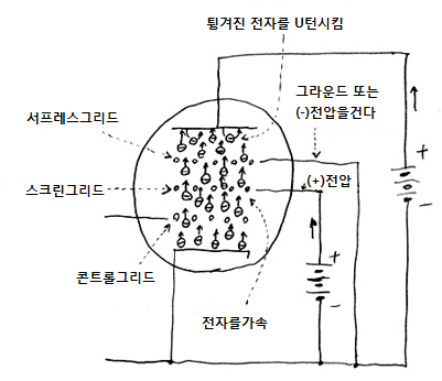 결국, 양극 전류를 증가 시키고 싶은데 스크린그리드의 전류가 증가 해버리고 말아 곤란하게 됩니다. 그래서 양극 근처에 서프레서 그리드라는 것을 넣어서 이것을 그라운드 시키면 (보통 음극에 연결하는데 (-)전압을 걸때도 있음), 양극에서 튕겨 나간 전자를 유턴 시키는 것 입니다.