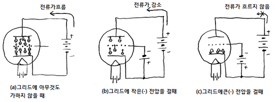 이제 그림(a)처럼 히터에 전류를 흘려 캐소드를 가열하고, 양극에 +전압을 걸면 2극관과 마찬가지로 음극에서 전자가 방출되어 양극으로 흘러들어가서 결국, 양극에서 음극으로 향하여 전류가 흐릅니다. 그 사이에 있는 그리드는 듬성 듬성하므로 전자의 흐름을 거의 방해하지 않습니다. 그러면, (b)와 같이 그리드에, 음극에 대해 작은 (-)전압을 걸어 보면,음극에서 방출된 전자는 그리드의 (-)와 반발하여 흐름의 방해를 받아 결국 양극으로 흘러 들어가는 전자가 적어지게 됩니다. 그리드의 (-)전압을 크게 하는 만큼 반발도 강해져서 양극에 도달하는 전자가 줄어들게 됩니다. 그리드의 (-)전압이 어느 점에 이르면 (c)처럼 전자는 그리드에 전부 반발되어 양극에 도달하는 전자가 제로로 됩니다.